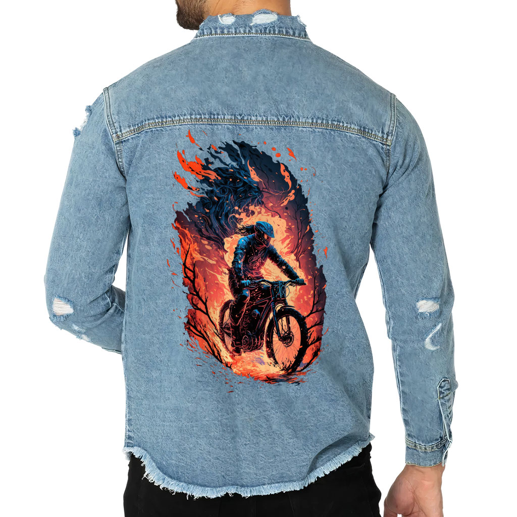 Biker Men’s Denim Shirt with Distressed – Fire Print Denim Shirt – Cool Shirt for Men