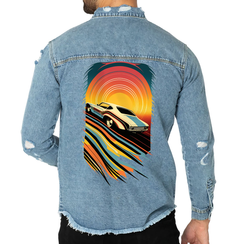 Car Graphic Men’s Denim Shirt with Distressed – Vintage Denim Shirt – Cool Shirt for Men