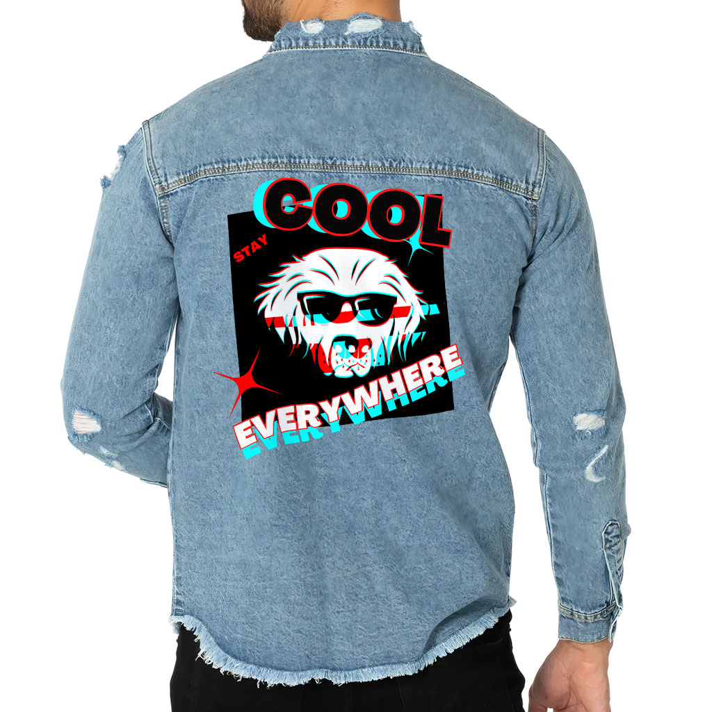 Cool Dog Men’s Denim Shirt with Distressed – Digital Art Denim Shirt – Graphic Shirt for Men
