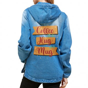 Coffee Is a Hug in a Mug Women’s Denim Jacket with Hoodie – Best Quote Ladies Denim Jacket – Printed Denim Jacket
