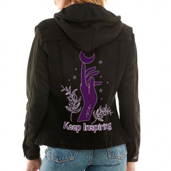 Keep Inspiring Women’s Denim Jacket with Hoodie – Hand Ladies Denim Jacket – Themed Denim Jacket