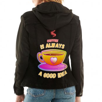 Coffee Is Always a Good Idea Women’s Denim Jacket with Hoodie – Heart Ladies Denim Jacket – Cute Denim Jacket