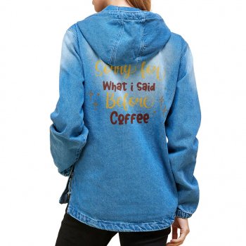 Funny Coffee Women’s Denim Jacket with Hoodie – Quote Ladies Denim Jacket – Themed Denim Jacket