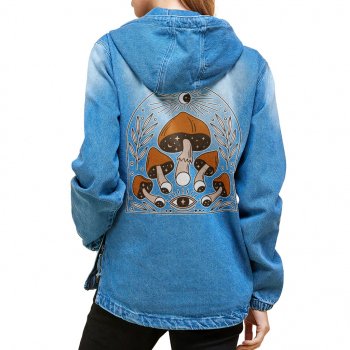 Spiritual Design Women’s Denim Jacket with Hoodie – Mushroom Ladies Denim Jacket – Cool Art Denim Jacket