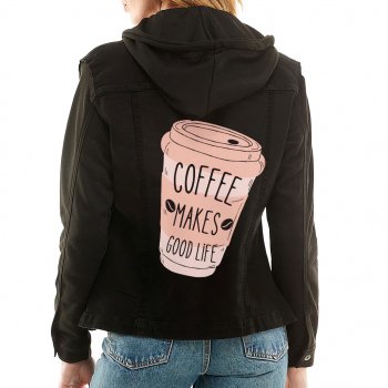 Coffee Ladies Denim Jacket with Fleece Hoodie – Trendy Women’s Denim Jacket – Printed Denim Jacket