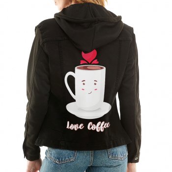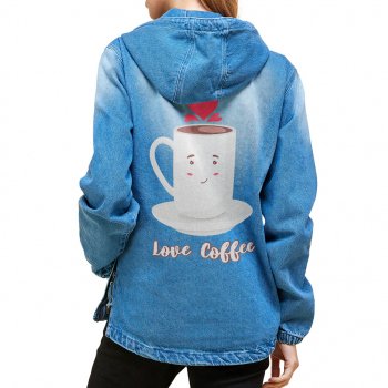 Cute Coffee Women’s Denim Jacket with Hoodie – Kawaii Ladies Denim Jacket – Heart Print Denim Jacket