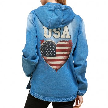 Patriotic Design Women’s Denim Jacket with Hoodie – US Flag Ladies Denim Jacket – Illustration Denim Jacket