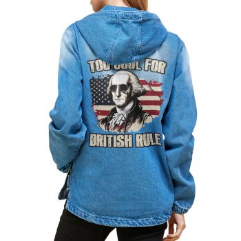 Too Cool for British Rule Women’s Denim Jacket with Hoodie – USA Flag Ladies Denim Jacket – Quote Denim Jacket