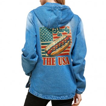 Party in the USA Women’s Denim Jacket with Hoodie – Hot Dog Ladies Denim Jacket – Themed Denim Jacket