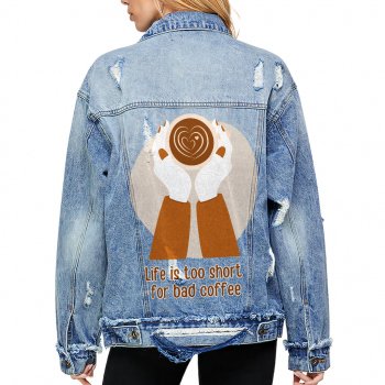 Life Is Too Short for Bad Coffee Women’s Oversized Denim Jacket – Cute Design Ladies Denim Jacket – Themed Denim Jacket