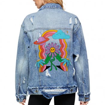 Rainbow Flower Women’s Oversized Denim Jacket – Funny Ladies Denim Jacket – Graphic Denim Jacket