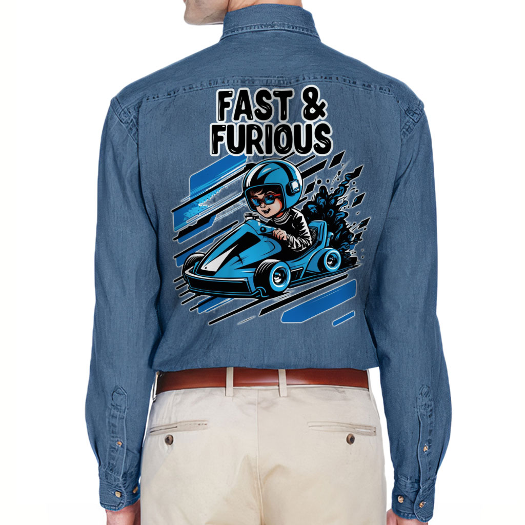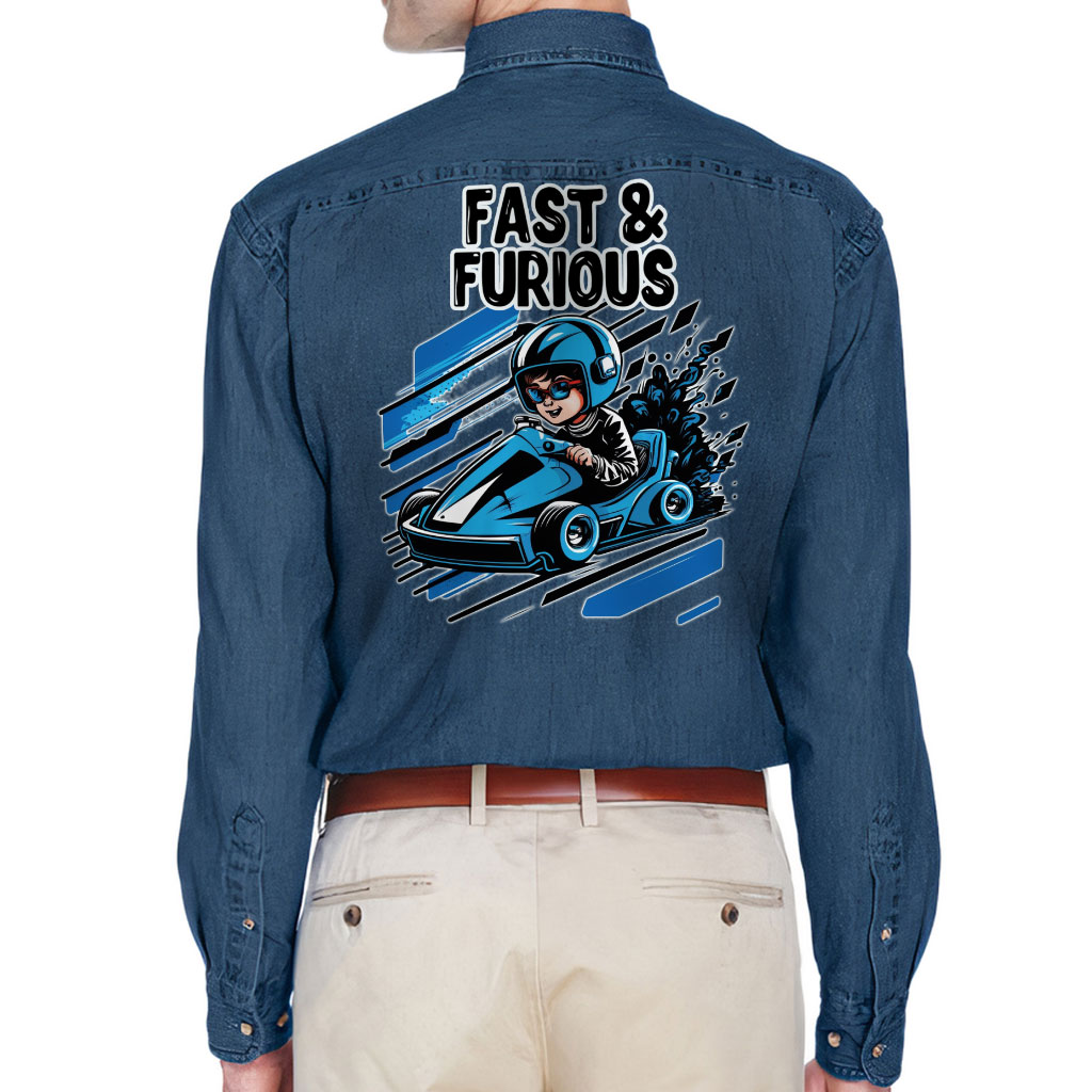 Race Car Men’s Denim Shirt – Graphic Art Denim Shirt – Cool Art Long Sleeve Shirt