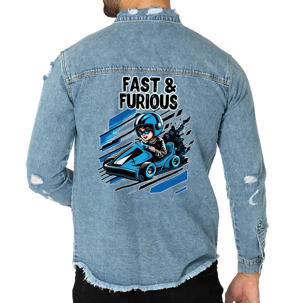 Race Car Men’s Denim Shirt with Distressed – Graphic Art Denim Shirt – Cool Art Shirt for Men