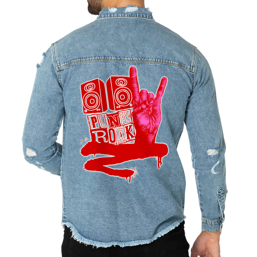 Rock Hand Sign Men’s Denim Shirt with Distressed – Music Denim Shirt – Graphic Shirt for Men