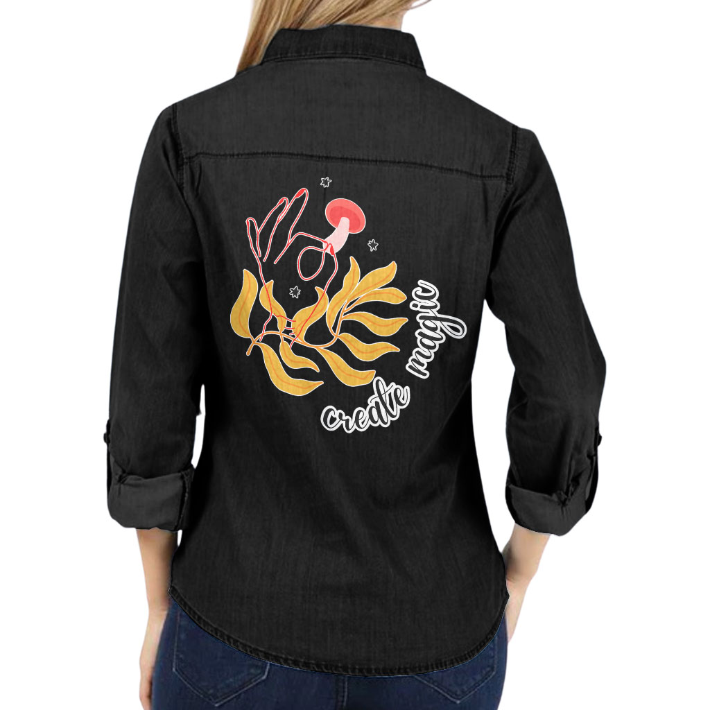 Spiritual Design Women’s Long Sleeve Denim Shirt – Mushroom Ladies Denim Shirt – Cool Art Denim Shirt